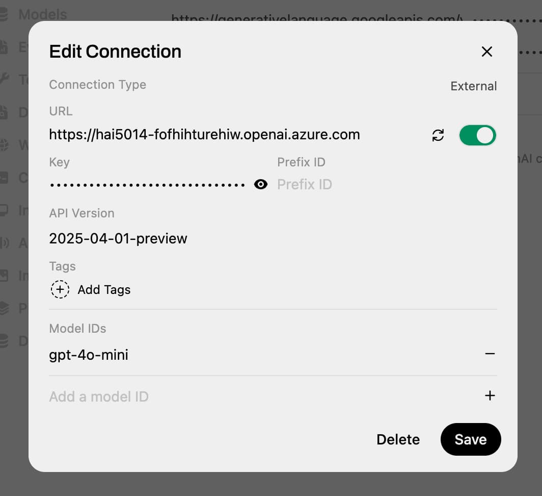 Currently, we have connected Open WebUI to Google’s LLM service Gemini. Open WebUI also supports other LLM services and APIs, such as OpenAI and Ollama, but in-built support for Azure OpenAI was only added recently. Since the Azure OpenAI service gives us access to latest and greatest models from OpenAI, and we have some Azure credits to spend, let’s give it a try.